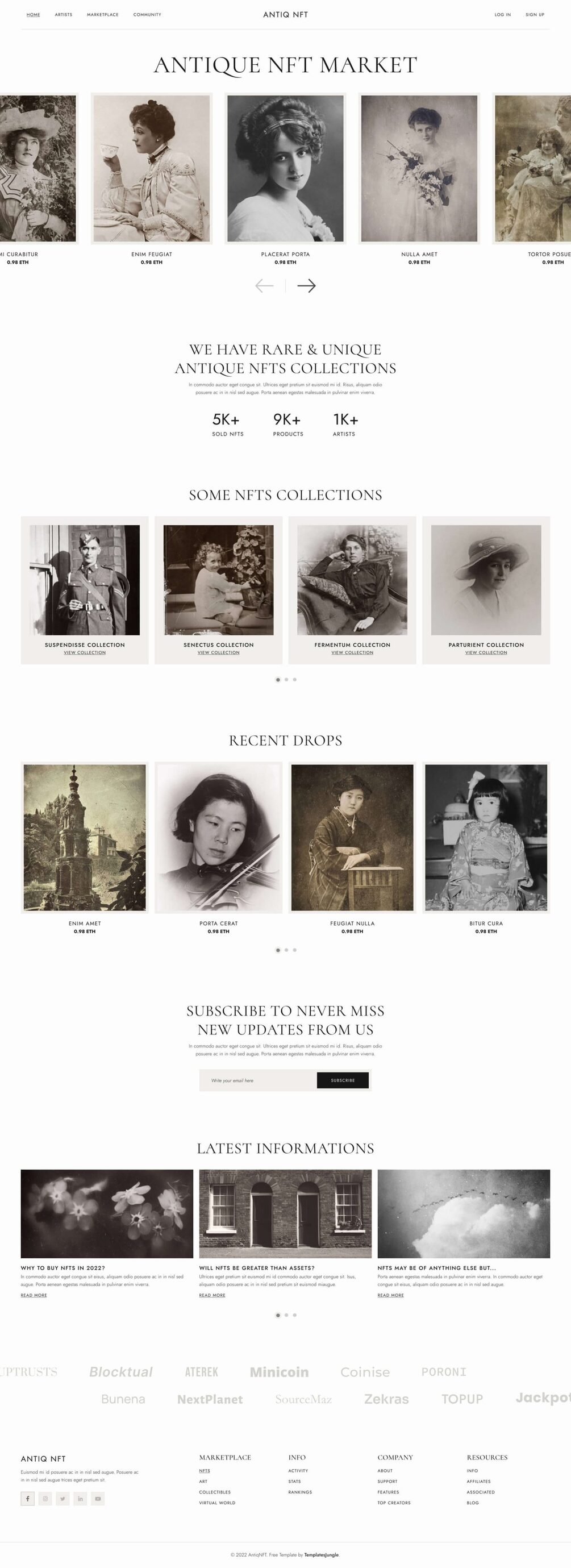 AntiqNFT is a free NFT Marketplace Figma web design template by TemplatesJungle. This template is designed for an NFT marketplace.