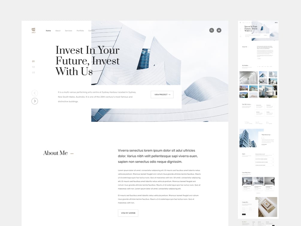 Arct is a free creative portfolio Figma website template for architect or architect agency by TemplatesJungle.
