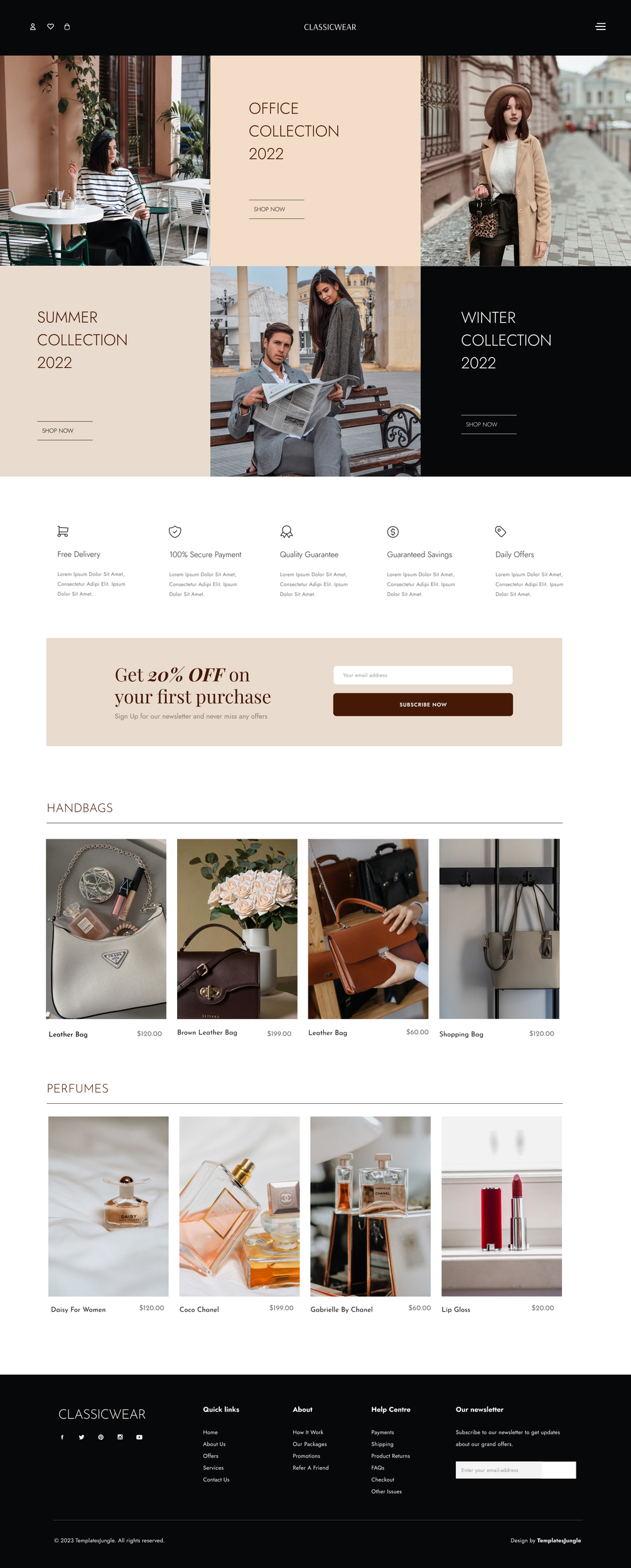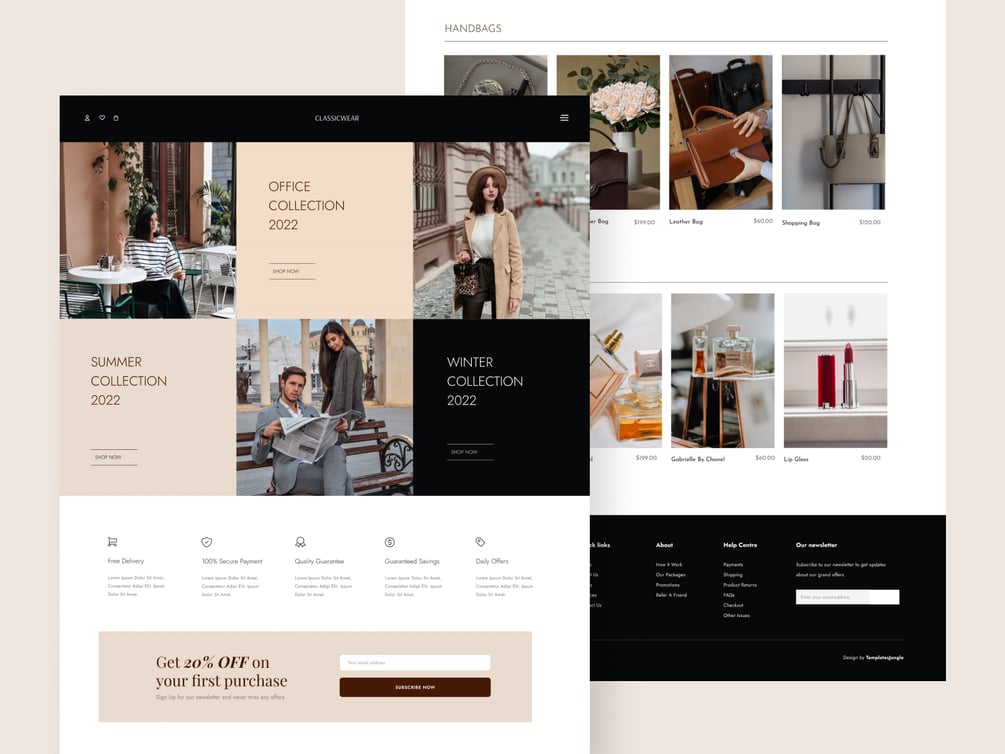 ClassicWear is a free Figma fashion store website template by TemplatesJungle. It is specially designed for showcasing premium quality fashion wear. However, it can also be used for any fashion store, online shopping website, e-commerce website, etc.