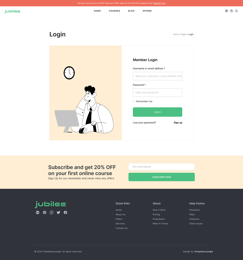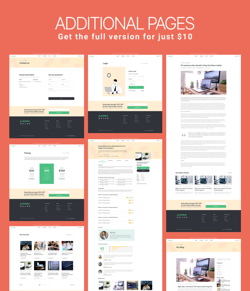 The full version of Jubilee goes beyond the basics, offering an additional 8 templates that cater to various educational scenarios. It includes a course detail page, login page, blog, blog single, pricing, and contact page.