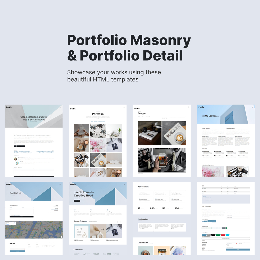 Portfo is 100% free and customizable Bootstrap portfolio website. It has a working contact page along with other 5 different HTML pages. Use 20+ design elements to create pages you need in your website.