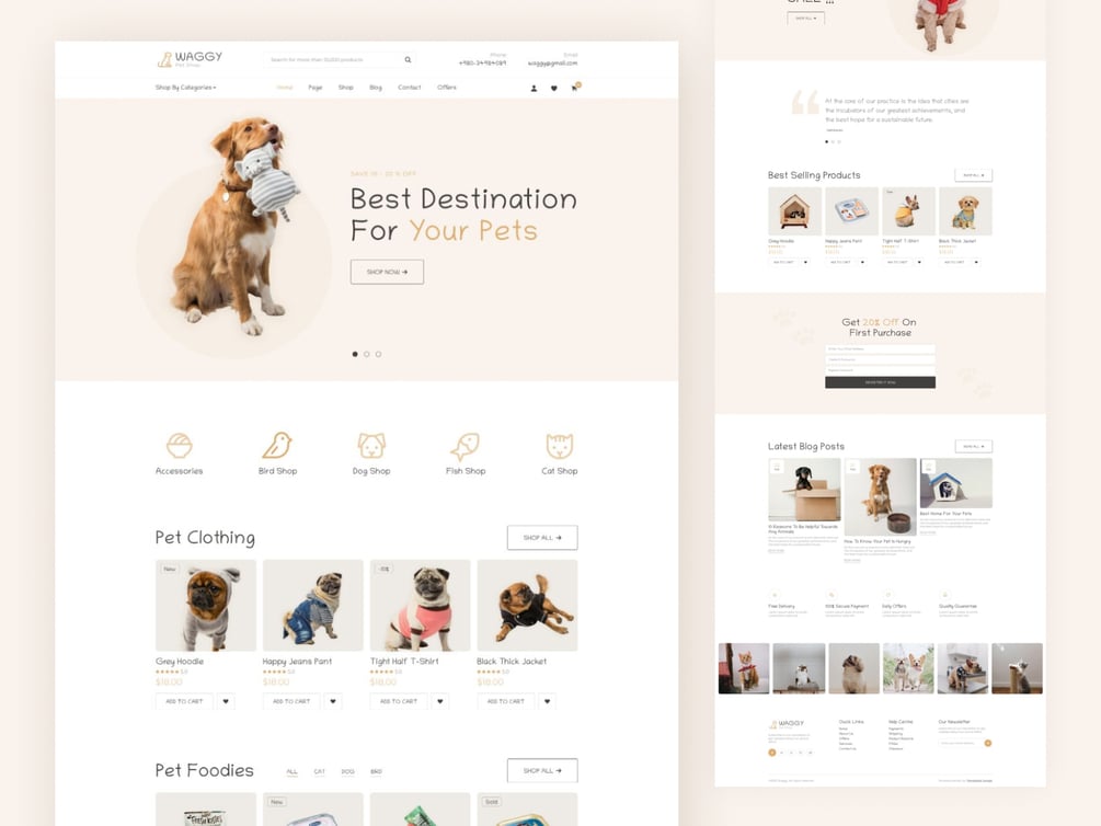 Waggy is a free HTML Bootstrap 5 website template for any e-commerce store by TemplatesJungle. It is suitable for any e-commerce store, online shopping website, pet store, shopping mart website, online shopping cart, clothing store, toy store, etc. Mainly it is specially designed for pet shops.